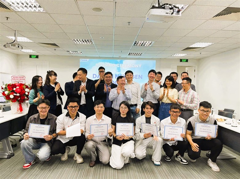 Sau 01 tháng học tập, trải nghiệm môi trường thực tế tại Công ty, ngày 25/03/026 đã diễn ra buổi lễ tổng kết chương trình, khép lại một hành trình đáng nhớ của các bạn sinh viên. Đặc biệt buổi lễ còn có sự tham gia của các thầy giảng viên Khoa Năng lượng mới: Thầy Nguyễn Đăng Toản – Trưởng Khoa, thầy Nguyễn Quốc Uy – Tổ trưởng tổ Kỹ thuật nhiệt và thầy Phạm Quang Vũ – Bí thư liên chi đoàn Khoa. Chương trình không chỉ thể hiện sự hợp tác bền chặt giữa doanh nghiệp và nhà trường mà còn là nơi các bạn sinh viên được tỏa sáng, thể hiện bản thân. Tại đây các bạn được giao lưu, học hỏi, chia sẻ kiến thức với các bạn sinh viên từ các Trường Đại học lớn trên cả nước mà còn tiếp thu được nhiều kiến thức thực tế từ chia sẻ của các giảng viên nội bộ của Công ty. Không chỉ là kiến thức chuyên ngành mà các bạn còn được rèn luyện các kỹ năng mềm như kỹ năng làm việc nhóm, làm việc độc lập, tư duy giải quyết vấn đề, ... Những trải nghiệm này đã giúp các bạn sinh viên mở rộng góc nhìn nghề nghiệp, củng cố kiến thức chuyên môn và định hình rõ hơn con đường phát triển trong tương lai. Học bổng Daikin NextGen vì thế không chỉ mang giá trị vật chất mà còn là sự ghi nhận xứng đáng cho những nỗ lực không ngừng trong học tập và rèn luyện của các bạn sinh viên, là động lực để các bạn tiếp tục cố gắng và khẳng định bản thân trên con đường đã chọn.